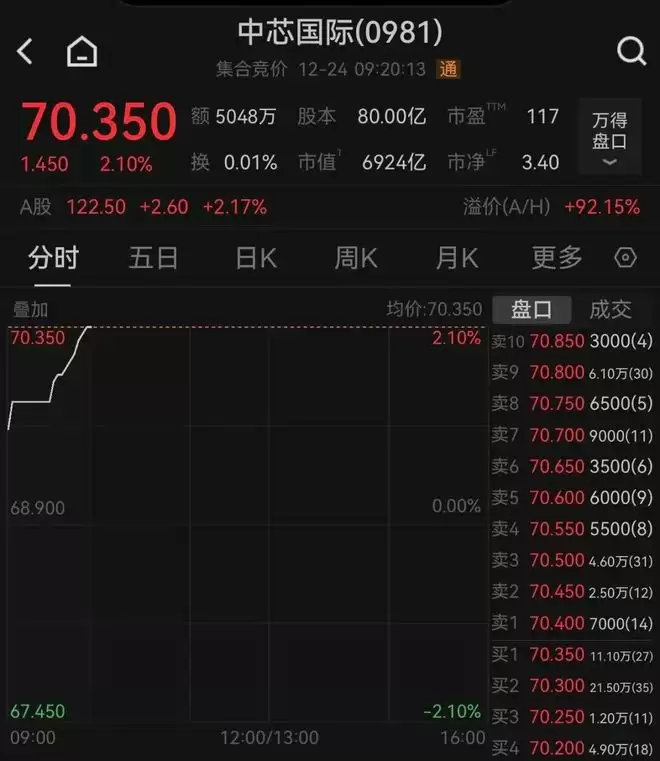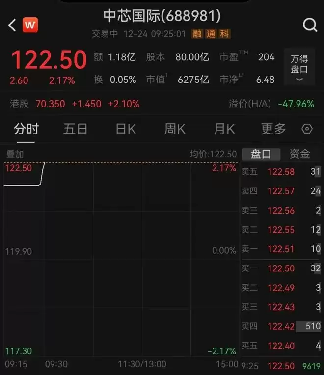 12月24日,中芯国际A股和H股在开盘后双双走高,涨幅均超过2%。根据最新数据,其A股股价达到每股122.5元,H股股价则为每股70.35港元。