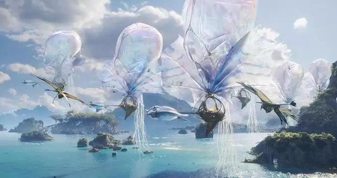 巨型水母牵引着成队的飞船在空中翱翔,底下是蔚蓝色的海水,奇石与森林悬浮在云雾中,时隔三年,我们又回到了《阿凡达》镜头下的潘多拉星球。
