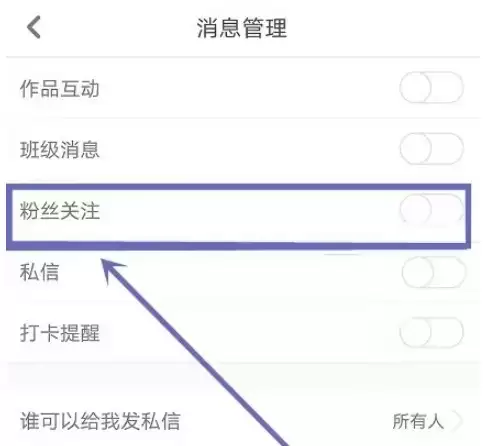 最后,在消息推送的管理界面,你就能看到“粉丝关注”的选项,只需点击它后面的开关按钮,将其开启就完成了。