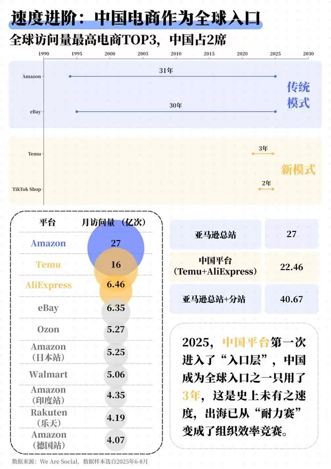 亚马逊花了三十多年完成全球化布局,而Temu、AliExpress等中国平台,仅用两到三年时间便跻身全球访问量前列。二者的差距不仅体现在补贴力度上,更在于供应链的深度整合、组织运行的效率,以及履约体系的整体压缩能力。