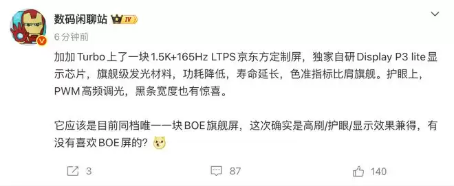 12月24日,知名数码博主“数码闲聊站”曝光了一加Turbo的屏幕规格。据悉,该机将搭载一块1.5K分辨率、165Hz刷新率的LTPS京东方定制屏,并采用独家自研的Display P3 lite显示芯片。屏幕继承了旗舰级的发光材料,在降低功耗、延长寿命的同时,其色准表现足以媲美旗舰机型。在护眼方面,它支持PWM高频调光,其黑条宽度控制也带来了惊喜。“这应该是目前同档位唯一一块采用BOE旗舰屏的产品,这次确实是高刷、护眼与显示效果兼得了。”