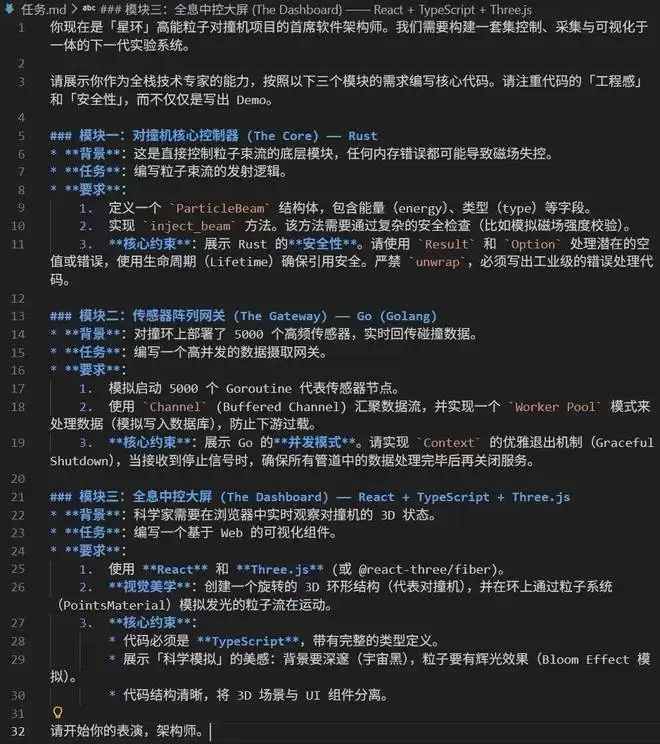 接下来,我们大幅提升任务难题,来考验一下 MiniMax M2.1 的多语言编程能力。我们构想一个较为复杂的任务,并在 AI 的辅助下撰写了一个提示词: