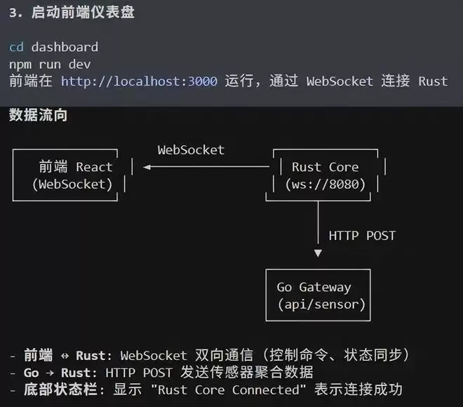 左侧为 React 前端,右上为 Go 语言写的网关,右下为 Rust 写的核心程序