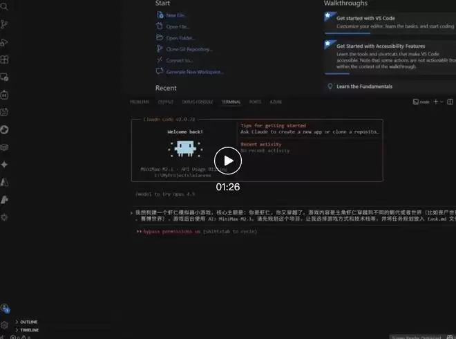 在 Claude Code 配置好 MiniMax M2.1 之后,直接输入提示词开始构建!