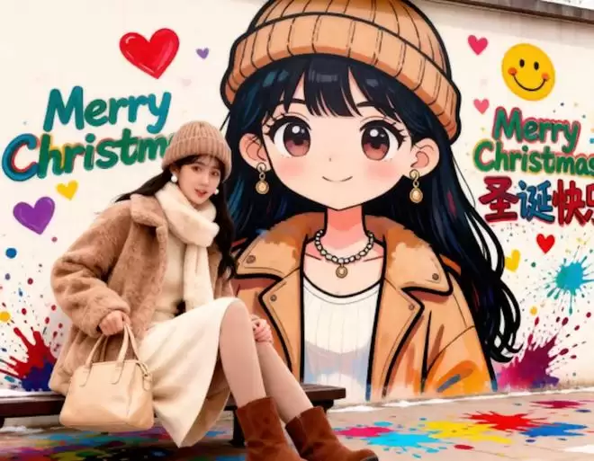 生成竖版3:4画面比例的“真人与其对应卡通壁画合影”场景图像:将上传的真实人物照片以原样保留服装、发型、妆容置于画面左侧/前方,调整人物的动作和拍摄视角,以确保画面和谐。在真人背后墙面绘制1:1对应卡通壁画,厚涂质感且采用动漫风格大眼、柔和轮廓五官,完整复刻发型、服装及配饰细节如耳环、项链等,色彩饱和度高并带有涂鸦式笔触效果。墙面添加彩色涂鸦爱心、笑脸图案元素,地面点缀飞溅颜料装饰细节,壁画区域融入如“2026新年快乐”的中文字元素,字体风格契合涂鸦美学。确保真人与壁画比例、角度自然衔接,光照方向统一符合场景逻辑,保持整体色彩风格一致呈现生动、连贯且视觉和谐效果。