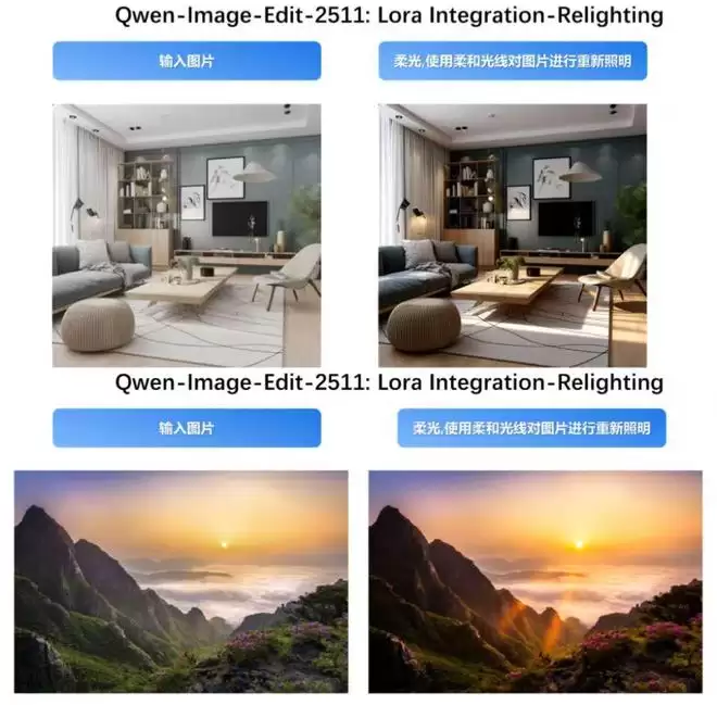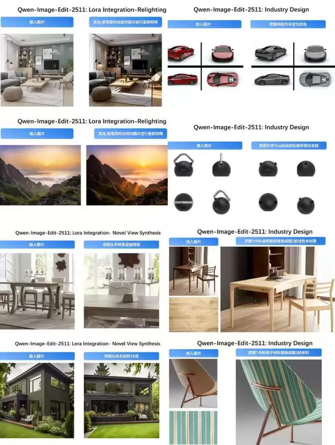 综合来看,内置LoRA的集成设计提升了Qwen-Image-Edit-2511在具体任务中的可用性,尤其在光照控制、材质替换、多视角生成等高频需求中展现出更高的商用适配性,为设计、营销、内容生成等场景提供了更低成本的图像处理方案。