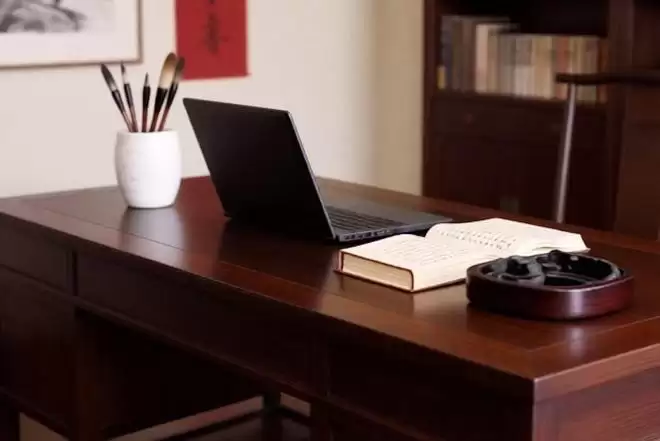 生成结果中,镜头确实发生变化,但桌面毛笔数量与书本打开状态与原图存在偏差,结构并不够严格。