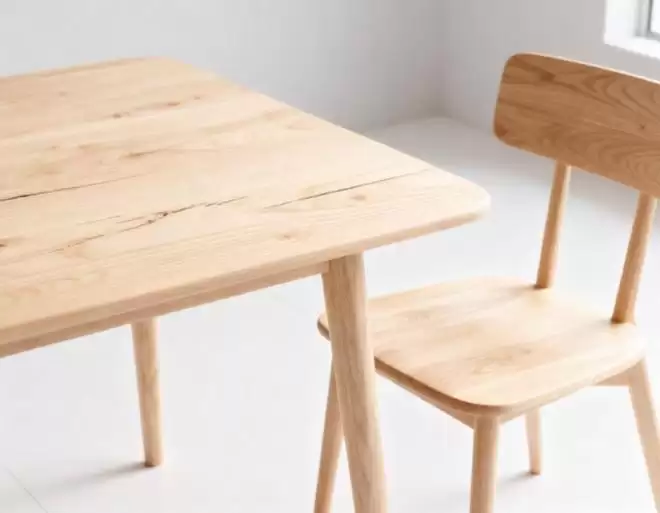 将家具图片中桌面与椅子的木质纹理替换为另一张图中的浅色松木材质,保持结构不变,仅替换材质贴图。
