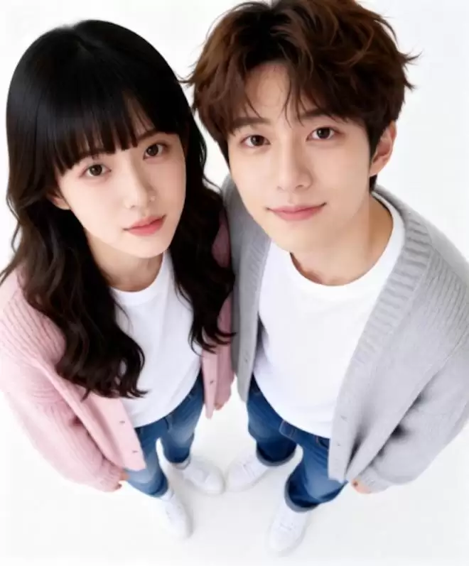 请将图1和图2融合成一张双人俯拍自拍照,画面构图紧凑,两位主体靠得很近,头部略微上仰,眼神直视镜头,营造出强烈的视觉冲击力。左侧人物站得略靠前,参考我图1的主体形象特征造型保持不变,需要保持人脸相似度;右侧人物参考图2的主体形象特征保持造型不变,需要保持人脸相似度,略微内扣身体,拍摄角度为高角度俯拍,使头部比例被夸张放大,符合典型的日韩视觉自拍风格。背景为纯白色,简洁干净,进一步凸显人物主体。画面风格偏向日系视觉系,整体画面清晰度高,用iphone前置自拍,最终呈现出精致、时尚、略带的合影效果。要求人物实现无缝融进画面,视觉过渡自然,整体画面光线明亮且均匀。