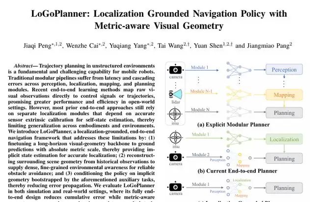 这项由上海AI实验室的彭嘉琪、蔡文哲、杨宇强、王泰、沈元(清华大学)和庞建苗共同完成的研究发表于2025年12月的arXiv预印本(论文编号:2512.19629v1),标题为"LoGoPlanner: Localization Grounded Navigation Policy with Metric-aware Visual Geometry"。有兴趣深入了解的读者可以通过这个编号查询完整论文。