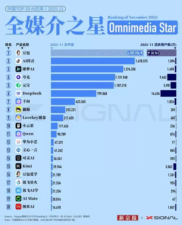 这份榜单由新京报AI研究院与Xsignal联合编制,依据全媒介声量评出2025年11月国内最具影响力的20款AI应用,同时收录产品类别、所属企业及最新月活跃用户数据,以反映行业动态。