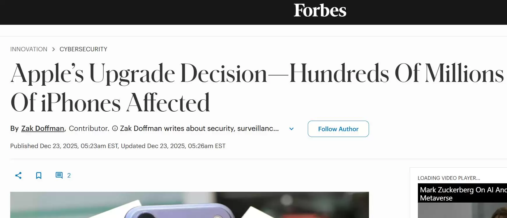 【环球网科技综合报道】12月24日消息,据福布斯报道,苹果公司近期加速推进其系统升级策略,要求所有iPhone 11及后续机型的用户立即从iOS 18迁移至iOS 26。此举将直接影响全球数亿设备用户的安全。这一决定源于最近确认的多起针对iPhone的高级持续性威胁(APT)攻击。