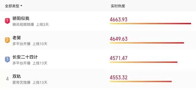 同类型的《双轨》虽然开播了,但却是无效开播,热度排名仅第四,不及《长安二十四计》,更不及《老舅》。