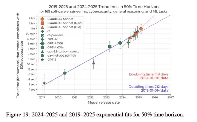 也就是说,在过去的几年里,AI的能力不是一条稳定的上升线——而是在某个时间点突然开始更快地往上冲刺。