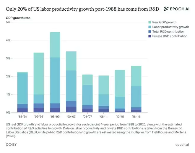 这是因为,从历史数据看,在1988–2020年这三十多年里,研发活动对整体生产率的贡献其实相当有限。