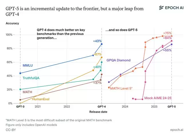 无论是GPT-4还是GPT-5,都在基准测试中都实现了重大飞跃,大大超越了它们前代产品的性能。