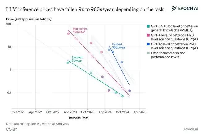 在2024年4月至2025年3月期间,Epoch AI观察到在同等性能水平下,每枚token的价格下降了10倍以上。