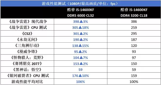 另外在《怪物猎人:荒野》这样的多人游戏中,酷睿i5-14600K+DDR5 6000相对酷睿i5 14600K + DDR4 3200的优势也是很大的,领先幅度达到了7%。综合全部游戏来看,酷睿i5-14600K+DDR5 6000平均领先的幅度为6%。可见在内存延迟并不占优势的前提下,DDR4 3200内存确实拖了酷睿i5-14600K很大的后腿。