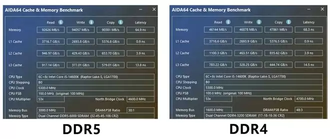 首先来看看同为酷睿i5-14600K CPU,分别搭配DDR4和DDR5时在内存理论性能表现上的区别。