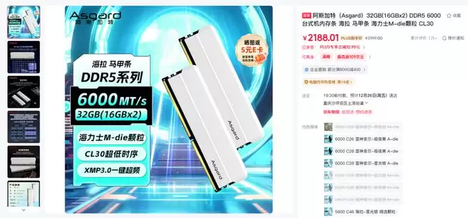 买内存就得32GB起步,当前DDR5内存的价格确实比较贵,主流的DDR5 6000 32GB套装来说,M-Die颗粒的产品至少都要2199元,如果是时序更低的A-die产品,那还要高出好几百元,着实不便宜。