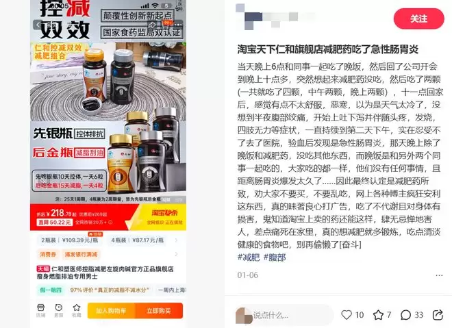 今年4月,快手有近2000万粉丝的网红"阿浩 不忘初心"在直播间带货"仁和左旋肉碱胶囊"时因"主播靠暴食和擦边卖爆减肥产品"引发网友反感而登上社媒热搜。仁和的这款"减肥胶囊",外包装明确提示,"保健食品不是药物,不能替代药物治疗疾病";不过,阿浩直播间却将这款胶囊夸出了"神药"的效果,不仅说胶囊没有任何副作用,还表示只要年满14周岁,不是孕妇哺乳期都可以吃。