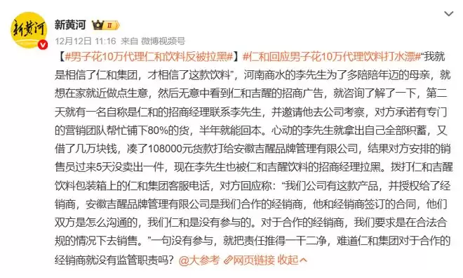 近日据媒体报道,河南男子投资超10万元代理销售一款"仁和吉醒能量饮料"后,货还没卖出去,就被饮料的招商经理拉黑;其联系到仁和集团后,对方却将责任推给经销商。