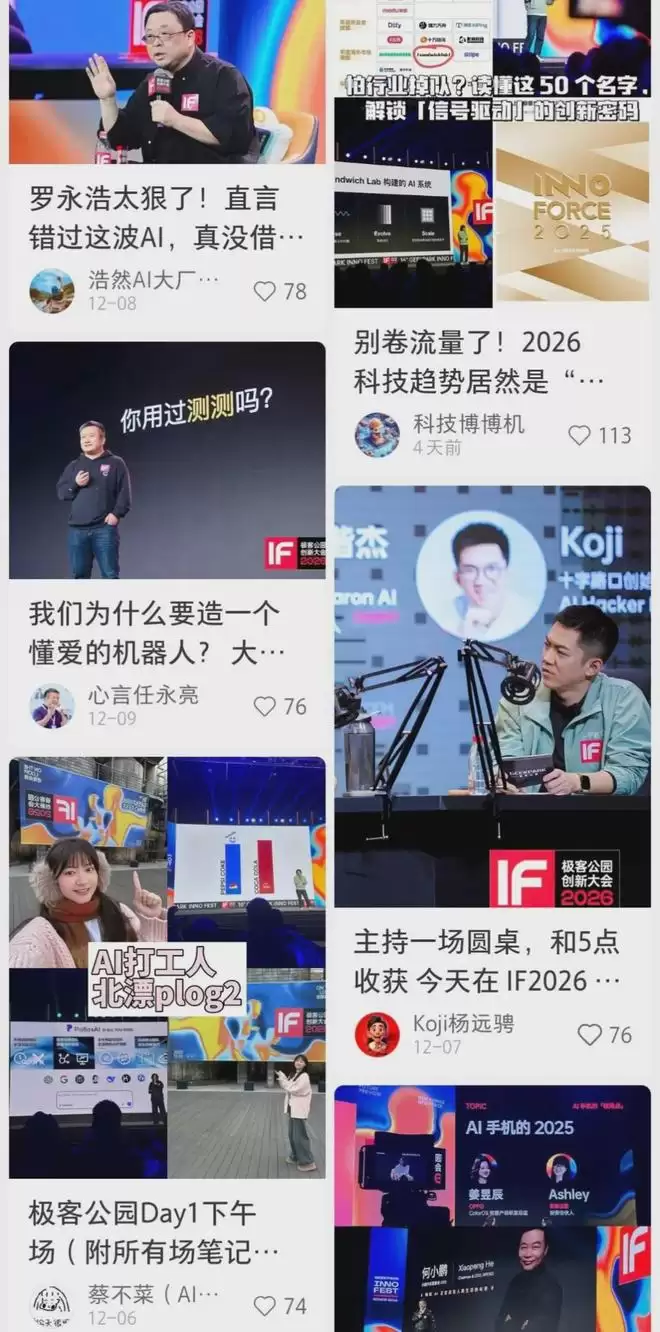比如今年我自己的小红书信息流里,就刷到了上百篇参会者发认真分享的 IF 大会的笔记。他们自己的视角和观点,他们的眼睛里看到的大会里那些具体的收获,是「原生」的、没有修饰的分享,它是如此的「真实而具体」,它能让你看到极客公园团队努力创造的东西,也真的有「真实而具体」的意义。