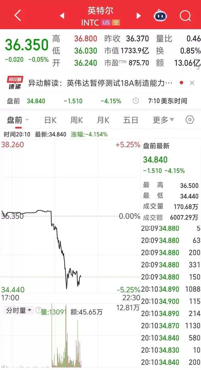 英特尔股价跌超5%,英伟达暂停18A工艺测试