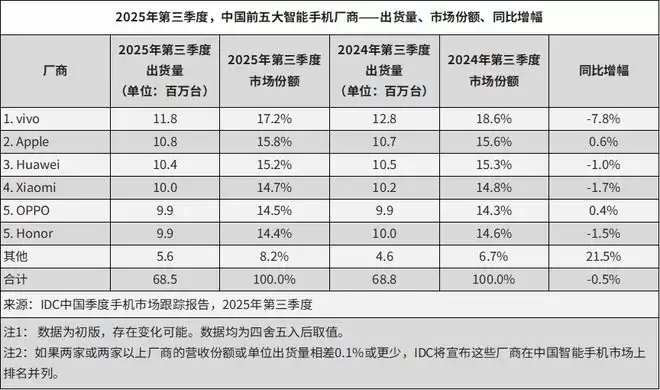 IDC数据显示,截至2025年三季度,vivo以17.2%位列榜首,同比下跌7.8%,是TOP5里下跌最严重的。小米和OPPO在14%区间徘徊,一个跌1.7%一个微增0.4%。荣耀和OPPO并列第五,荣耀份额14.4%却跌了1.5%。