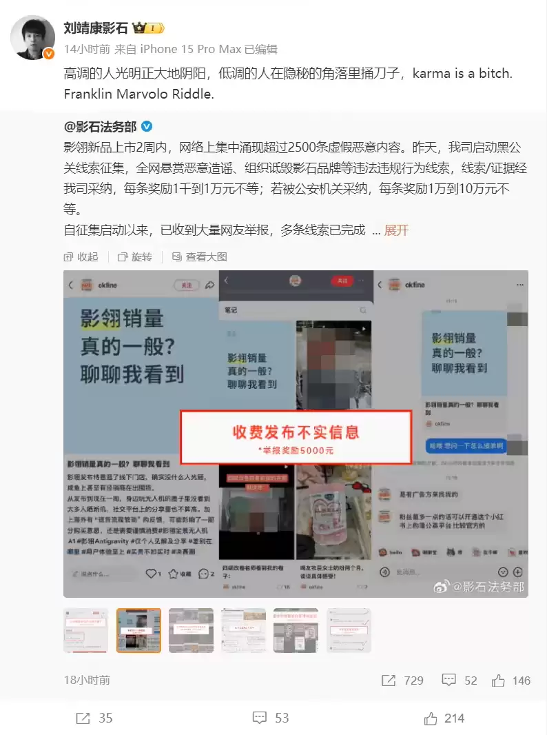 12月23日,影石首席执行官刘靖康转发该声明并发表评论,引用英文俚语“karma is a bitch”暗指因果报应,同时提及小说《哈利·波特》中反派伏地魔的原名“Marvolo Riddle”,并特别标注“Franklin”一词。公开信息显示,大疆创新首席执行官汪滔的英文名正是Frank,这一细节引发外界对行业竞争态势的联想。