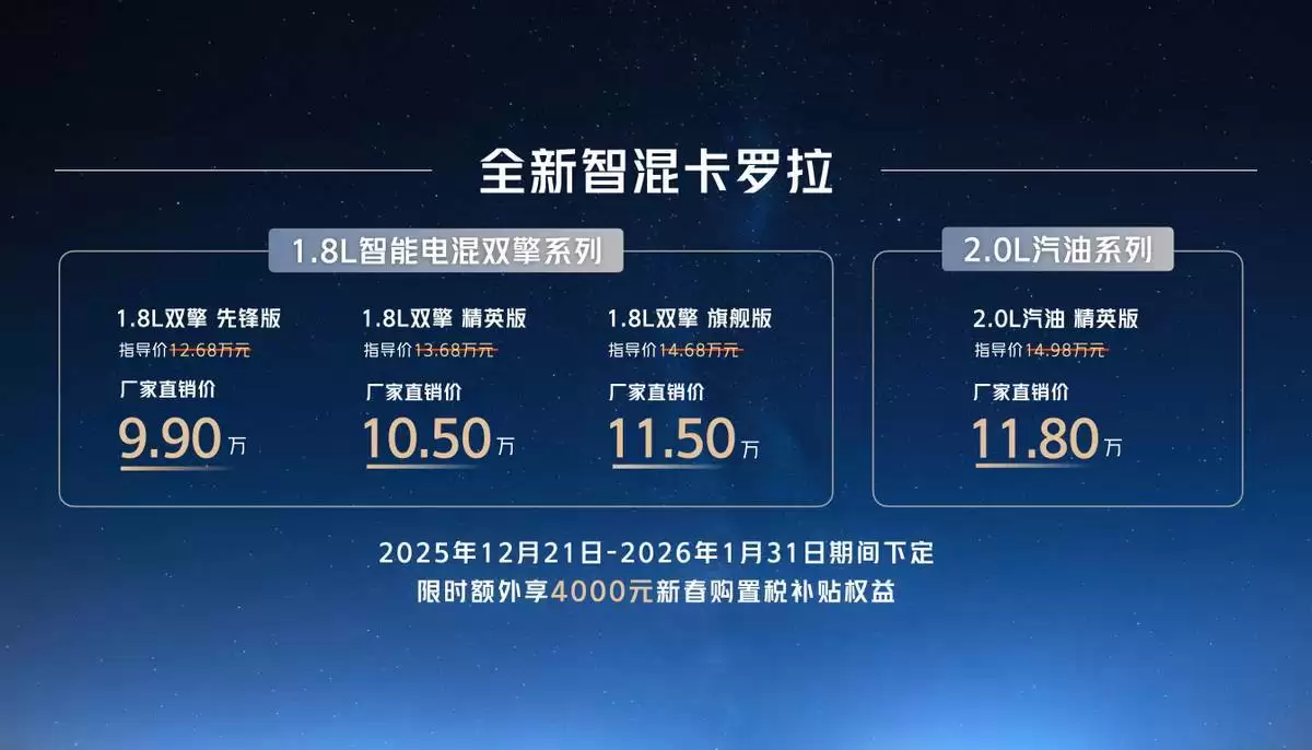 「全球高品质+中国新家轿」——全新智混卡罗拉正式登陆市场,共推出四个版本,厂商指导价区间为9.9万元至11.8万元。即日起至1月31日,消费者下订即可享受限时4000元新春购车补贴,为家庭购车增添更多实惠。