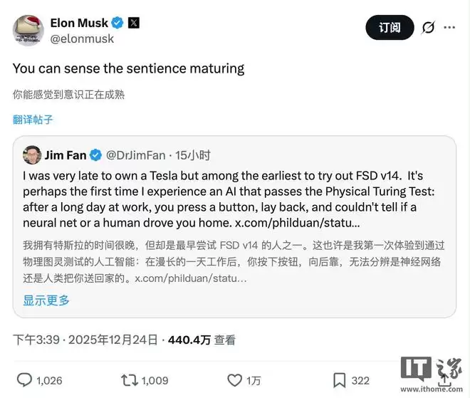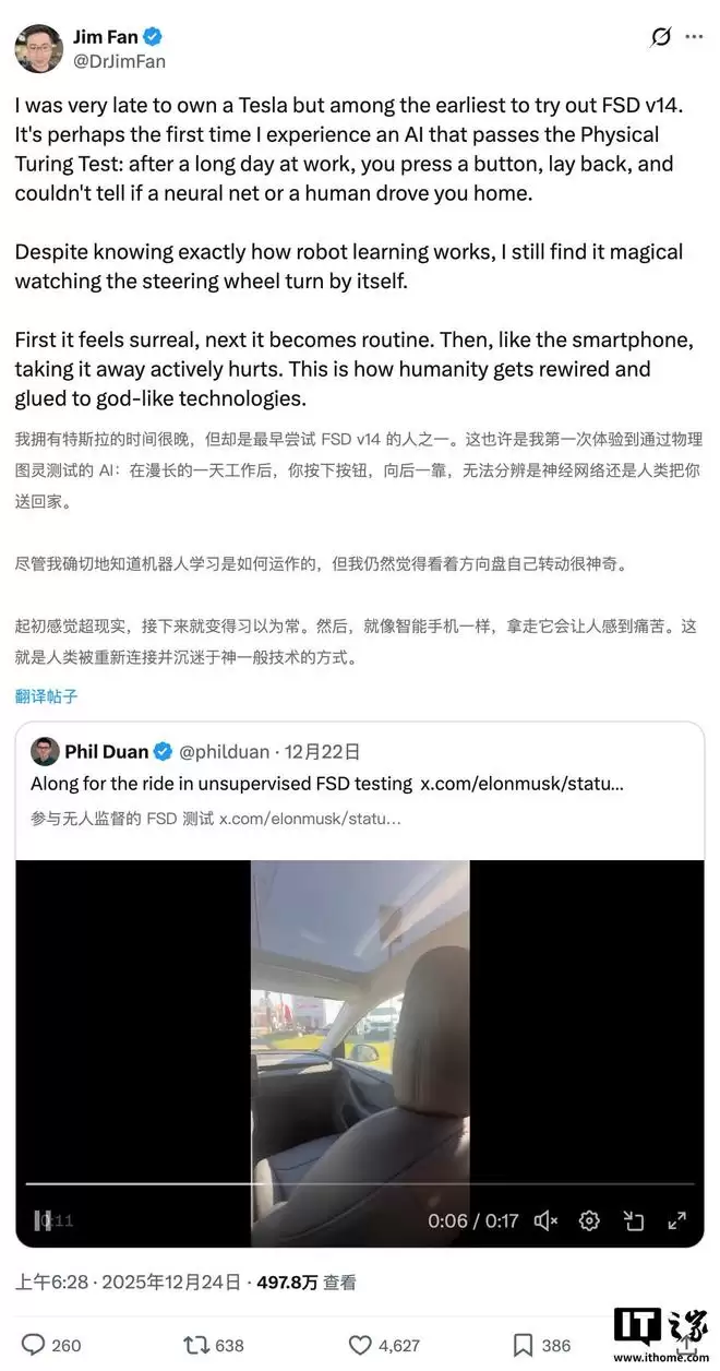 12月24日,IT之家发布消息,今晨,英伟达机器人业务总监Jim Fan在社交平台称,特斯拉的FSD v14(注:此为受监管版本)首次让AI成功通过了他所提出的“物理图灵测试”。
