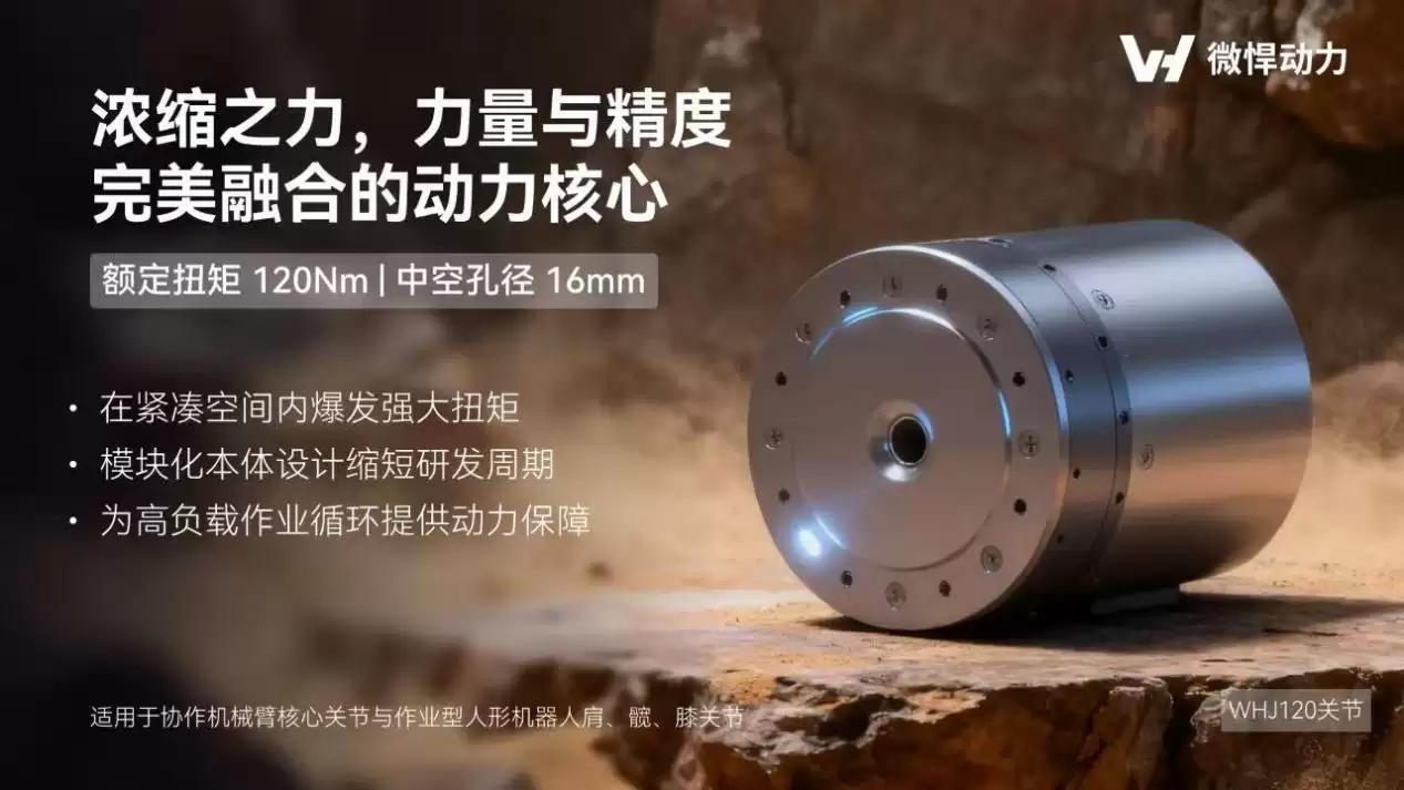 面向协作机械臂与作业型人形机器人核心受力关节的需求,大负载中空型WHJ120关节模组应运而生。该产品额定扭矩达120Nm,中空孔径16mm,在保持仿人关节紧凑结构的同时,实现高负载能力与高可靠性的平衡。大中空设计便于线束穿行,大幅简化整机本体结构,其高扭矩密度特性使机器人能在轻量化构型下完成重型装配、物料搬运等高强度作业,广泛适配协作机械臂的肩、肘、腰等核心关节,以及人形机器人的肩、髋、膝关节,成为提升整机负载与作业能力的动力基座。