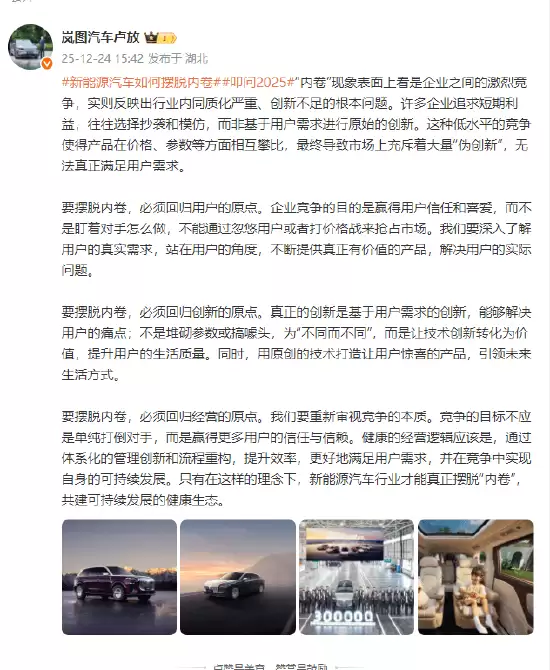 峰图汽车科技股份有限公司董事长卢放在社交平台发表观点,深入探讨新能源汽车行业如何突破“内卷”困境。他指出,当前行业内的“内卷”现象,看似是企业间竞争白热化的表现,实则暴露出深层次问题——产品同质化严重、创新动力匮乏。