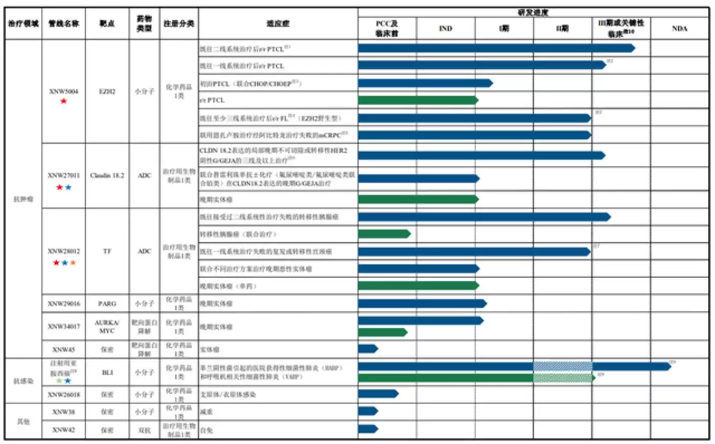 其次是“3”:抗肿瘤领域的XNW5004(EZH2抑制剂)、XNW27011(靶向Claudin 18.2的ADC药物)以及XNW28012(靶向TF的ADC药物)均已处于III期或关键性临床研究阶段。上述药物均在临床试验中展现出优越的疗效,可以为胰腺癌、胃癌、前列腺癌、外周T细胞淋巴瘤等重大疾病领域提供“从无到有”或“从有到优”的治疗手段。上述在研管线均已获得中国国家药品监督管理局药品审评中心(CDE)的突破性治疗药物认定,且XNW27011以及XNW28012已获得美国食品药品监督管理局(FDA)的快速通道认定(FTD),XNW28012已获得美国FDA的孤儿药认定(ODD)。