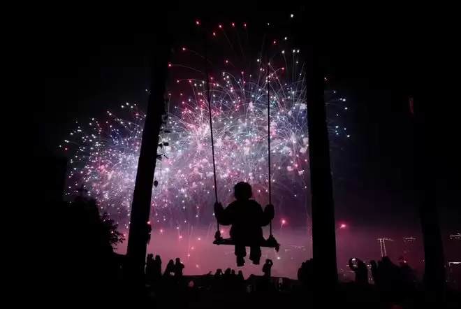 在下面这张记录烟花绽放的夜景样张中,背景的天空依然保持深邃纯净,而前景荡秋千的剪影轮廓清晰,远处的城市灯光与空中的烟花高光均未出现过曝。这充分印证了 LOFIC 技术配合骁龙 ISP 在高反差暗光环境下的光影还原能力,完美诠释了“夜色传神”的定义。