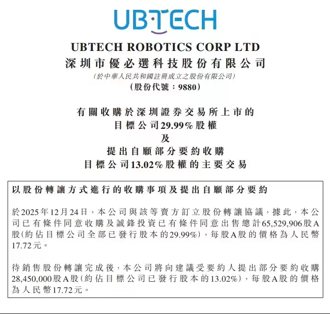 12月24日消息,优必选今日晚间发布公告,宣布计划以“协议转让 + 要约收购”的组合方式,共同收购深交所上市公司锋龙股份9395.75万股,约占锋龙股份公司总股本的43.01%。