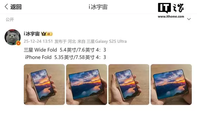 12月25日,IT之家援引数碼博主@i冰宇宙的最新消息透露,該博主於24日在微博分享了一組渲染圖,直觀對比了三星Wide Fold與傳聞中蘋果iPhone Fold兩款橫向摺疊屏手機的設計差異,似乎預示着兩大科技巨頭在這一新興市場的較量已悄然拉開序幕。