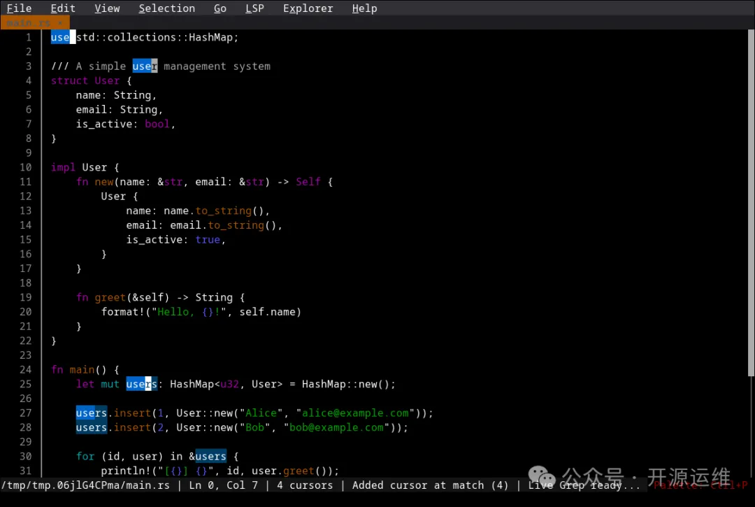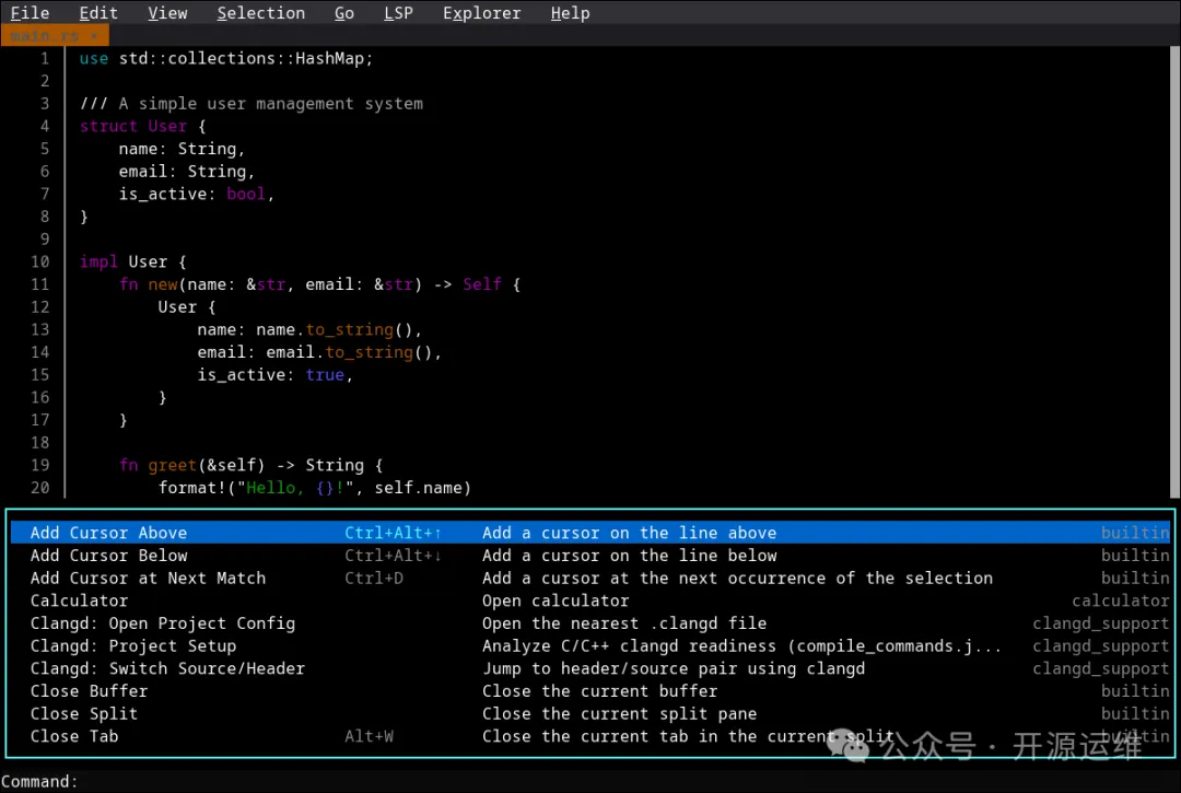 除了基础编辑,还支持多光标、智能搜索、分屏,并且内置了 LSP 支持,可以实现代码跳转、提示和自动补全,编程辅助功能齐全。