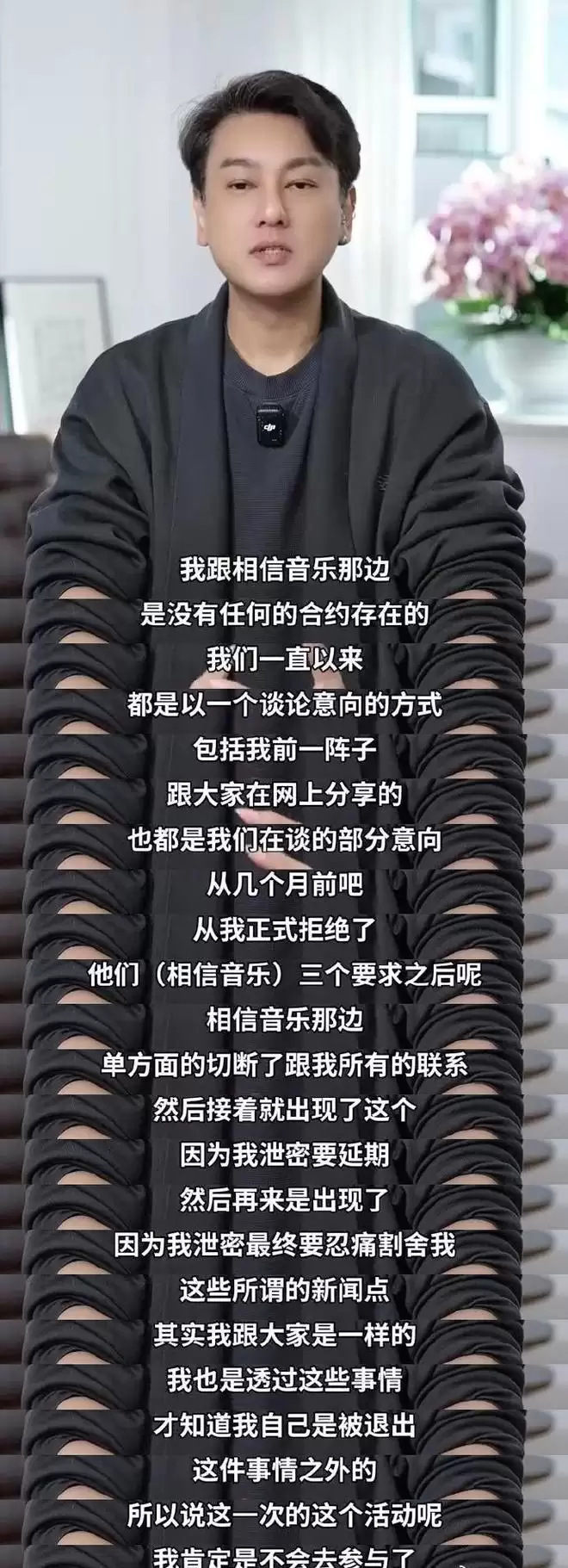 他还说他和“相信音乐”一直没有签约,双方只是有讨论意向。