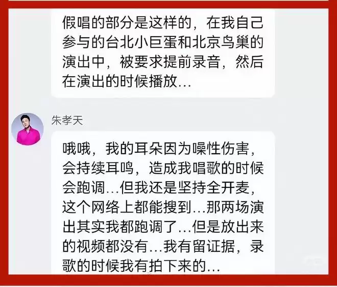 而在另一张粉丝群截图中可以看到,朱孝天指控“相信音乐”让歌手假唱。
