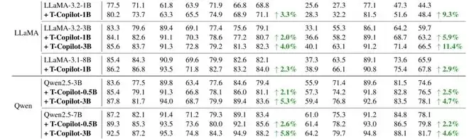 实验在多种主流模型(如LLaMA-3、Qwen2.5)和10个推理基准任务上验证了该方法的有效性。一个尤为亮眼的现象是:大模型 Pilot+小规模 Copilot+的组合,往往能显著提升性价比。
