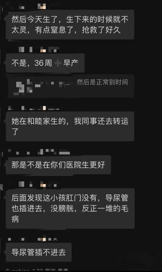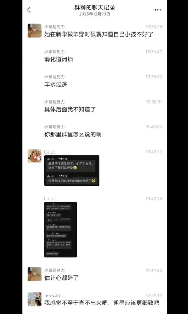 网友公开了疑似医护人员的聊天记录,其中提到阚清子的女儿出生时就被发现存在多项健康问题,在转院后不幸夭折。