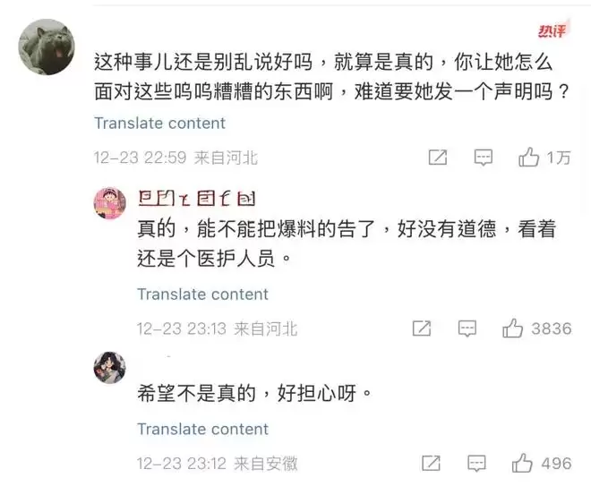 消息曝光后迅速登上热搜,不少网友谴责泄露消息的医护人员,并希望不论消息真假,都应尊重她的个人隐私。