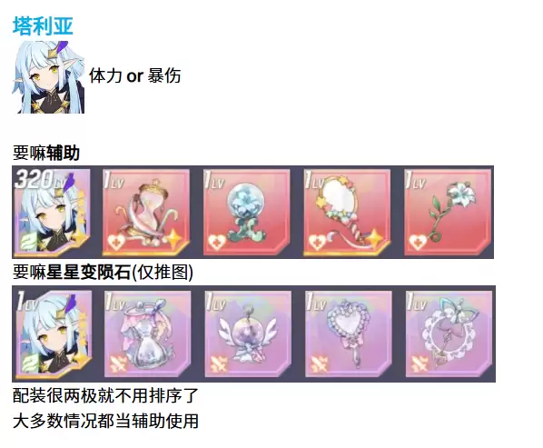 塔利亚这个精灵的配装也很两极化,要么堆体力要么堆暴伤。如果是辅助定位就选体力,如果想在推图的时候让她的星星技能变成陨石般的伤害那就选暴伤。因为配装思路差别太大了,所以属性优先级也没办法具体排序。大多数玩家在使用塔利亚的时候还是会选择辅助路线。