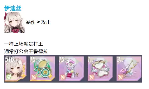 伊迪丝是个专门用来打王的精灵,配装方面暴伤优先于攻击。她上场基本就是为了对付特定的boss,比如公会王鲁德拉这种高难度关卡。如果你需要打这些boss的话,伊迪丝配上高暴伤装备能发挥出很不错的效果。