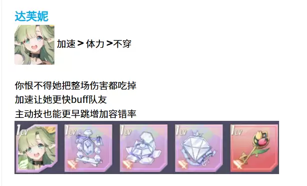 达芙妮这个精灵就更有意思了。她的装备思路是加速第一,体力第二,如果实在没有合适的装备甚至可以不穿。听起来好像有点夸张,但确实如此。因为达芙妮的作用就是要尽可能多地承受伤害,同时给队友提供增益效果。加速能让她更快地释放技能给队友上buff,而且她的主动技能有跳跃机制,速度提升后能更早触发跳跃,这样容错率就会提高很多。基本上,你就是希望她把整场战斗的伤害都吃下来,保护其他输出型精灵。