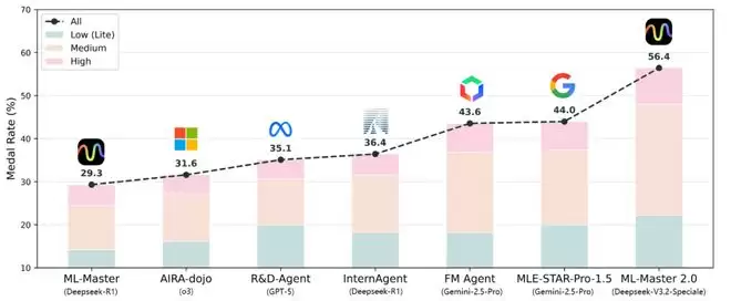 在OpenAI MLE-bench的系统评测中,ML-Master 2.0在完全无人工干预的条件下,基于国产Deepseek-V3.2-Speciale开源大模型,取得了56.44%的奖牌率,位列榜单第一,相较于Google等团队的基于闭源模型的智能体提升28.3%。
