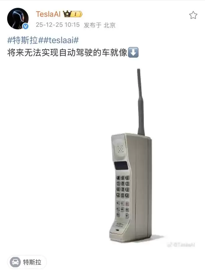 特斯拉旗下最新账号TeslaAI+今日发文指出,未来无法实现自动驾驶的车辆,就如同过时的“大哥大”手机一样将被淘汰。