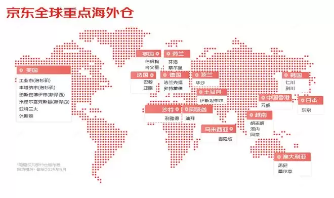 这家公司在海外投入大、资产重,试图在海外复刻国内的模式,在海外再造一个京东物流。据京东物流财报,截至2025年中,京东物流已拥有超130个保税仓库、直邮仓库和海外仓库,总管理面积超130万平方米,各类海外仓已覆盖全球23个国家和地区。